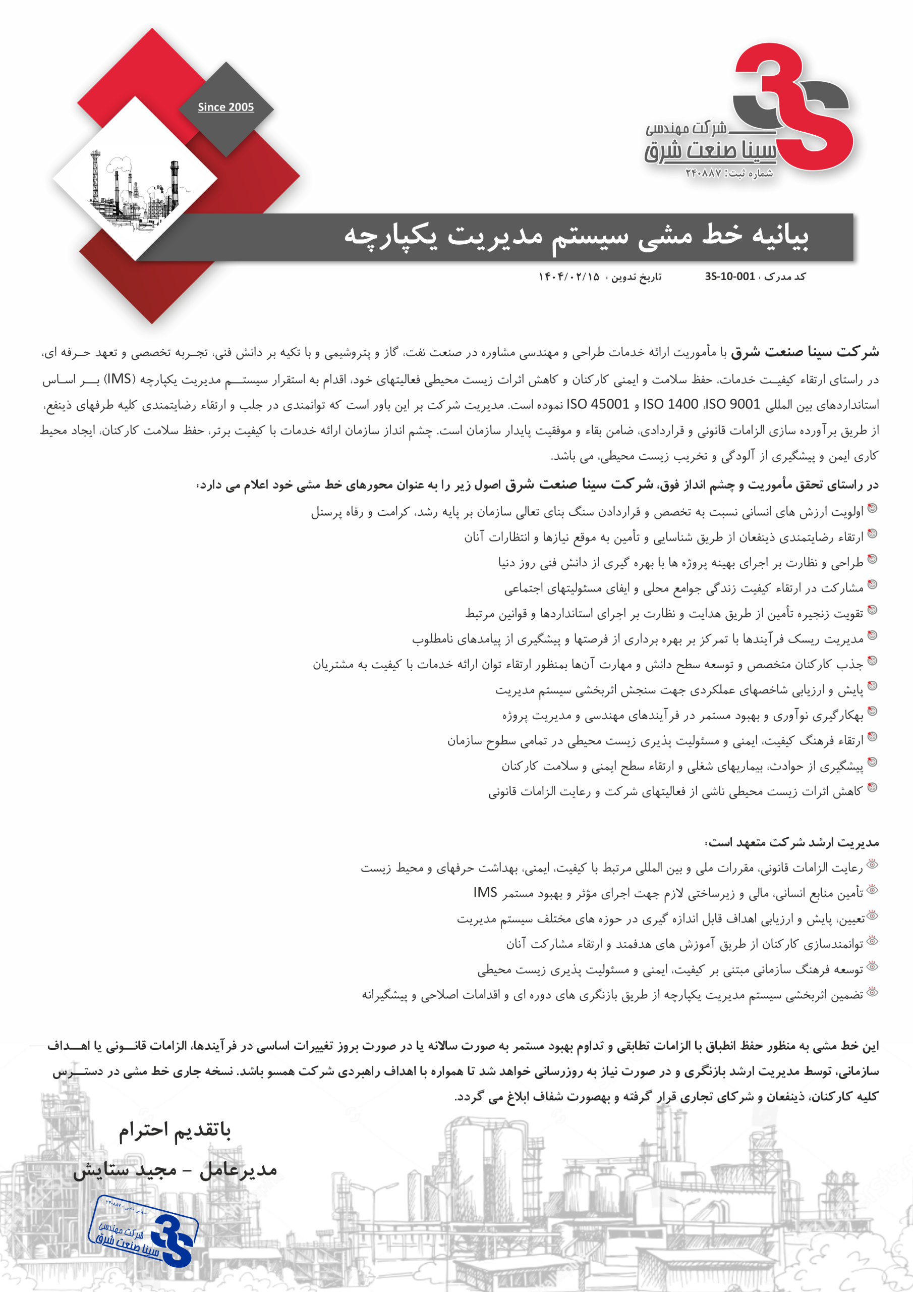 سینا صنعت شرق با تکیه بر تجربه و دانش تخصصی در حوزههای نفت، گاز و پتروشیمی، خدمات مهندسی نوین و راهکارهای کارآمد ارائه میدهد. هدف ما ارائه بهترین کیفیت، رعایت استانداردهای جهانی و جلب رضایت کامل کارفرمایان است.